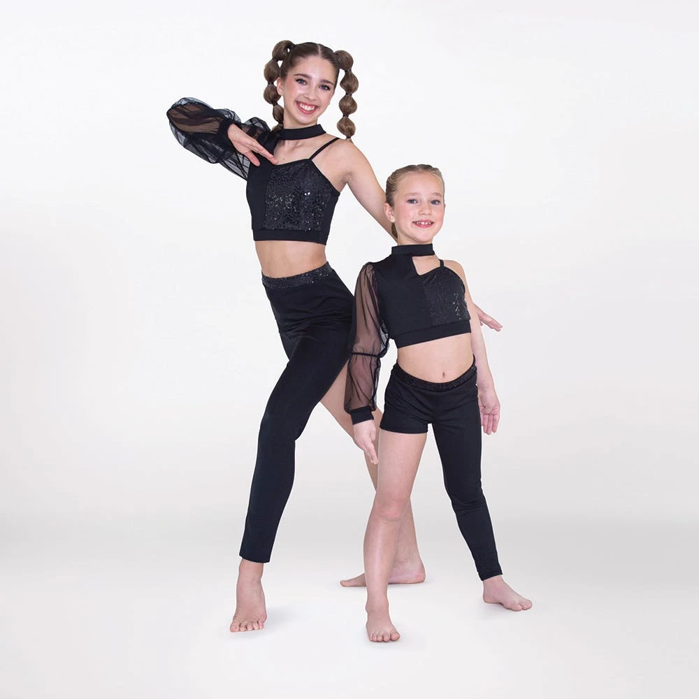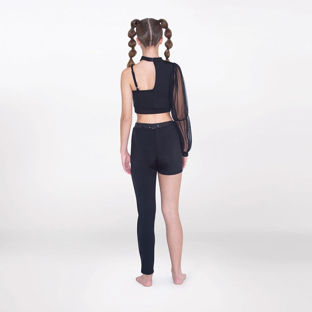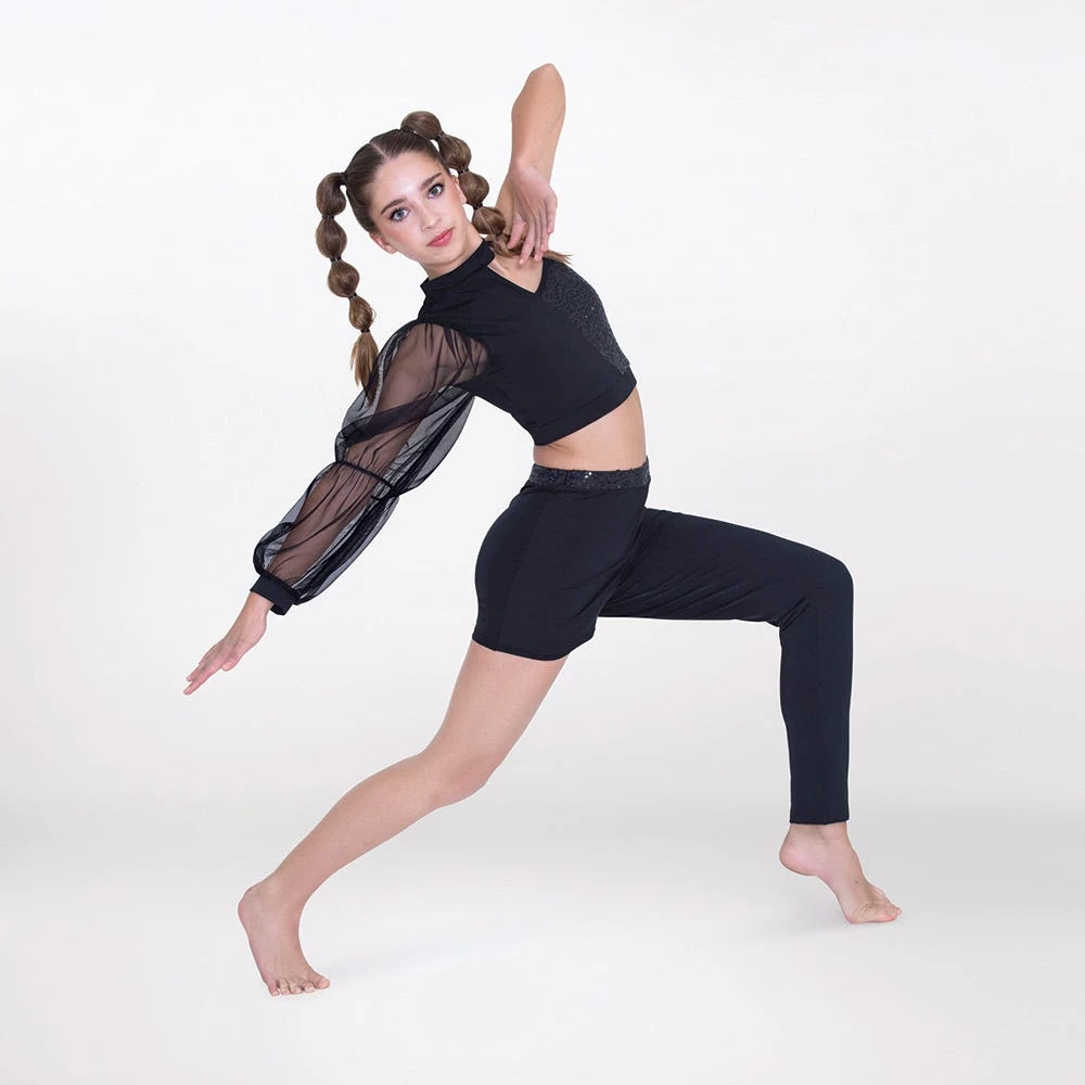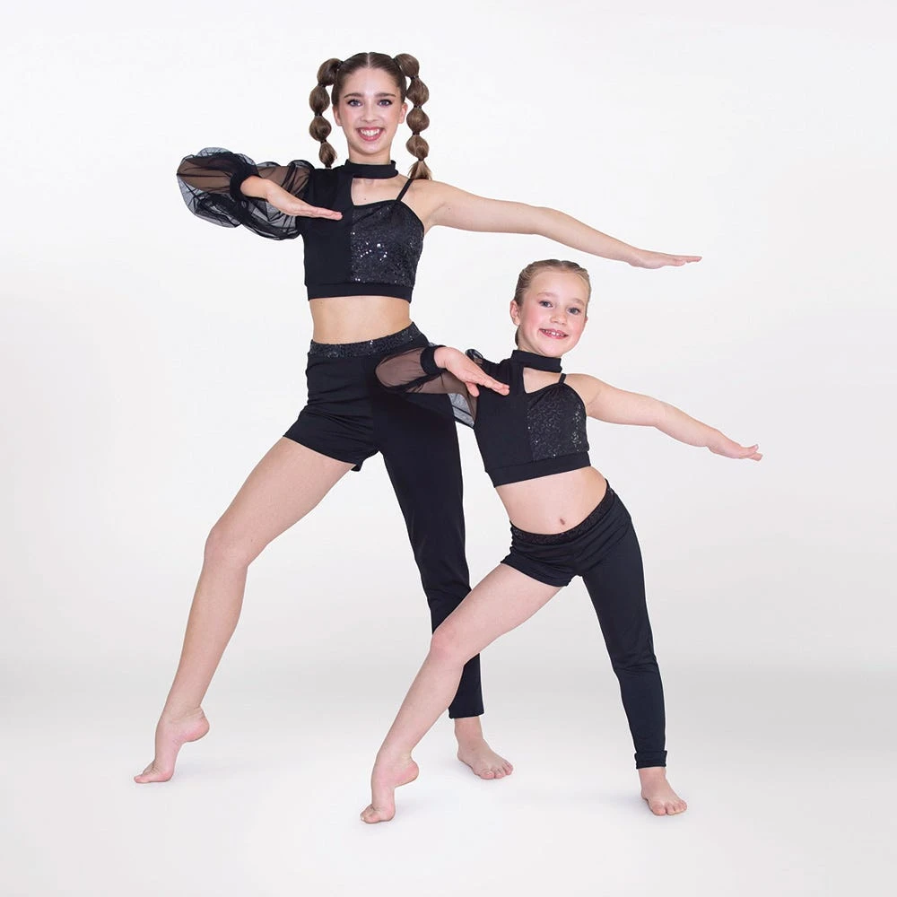 - This 1st Position two-piece is perfect for sassy contemporary performers, owing to its single mesh puff sleeve, asymmetric cut and a sprinkling of sequins, capturing a dramatic effect.