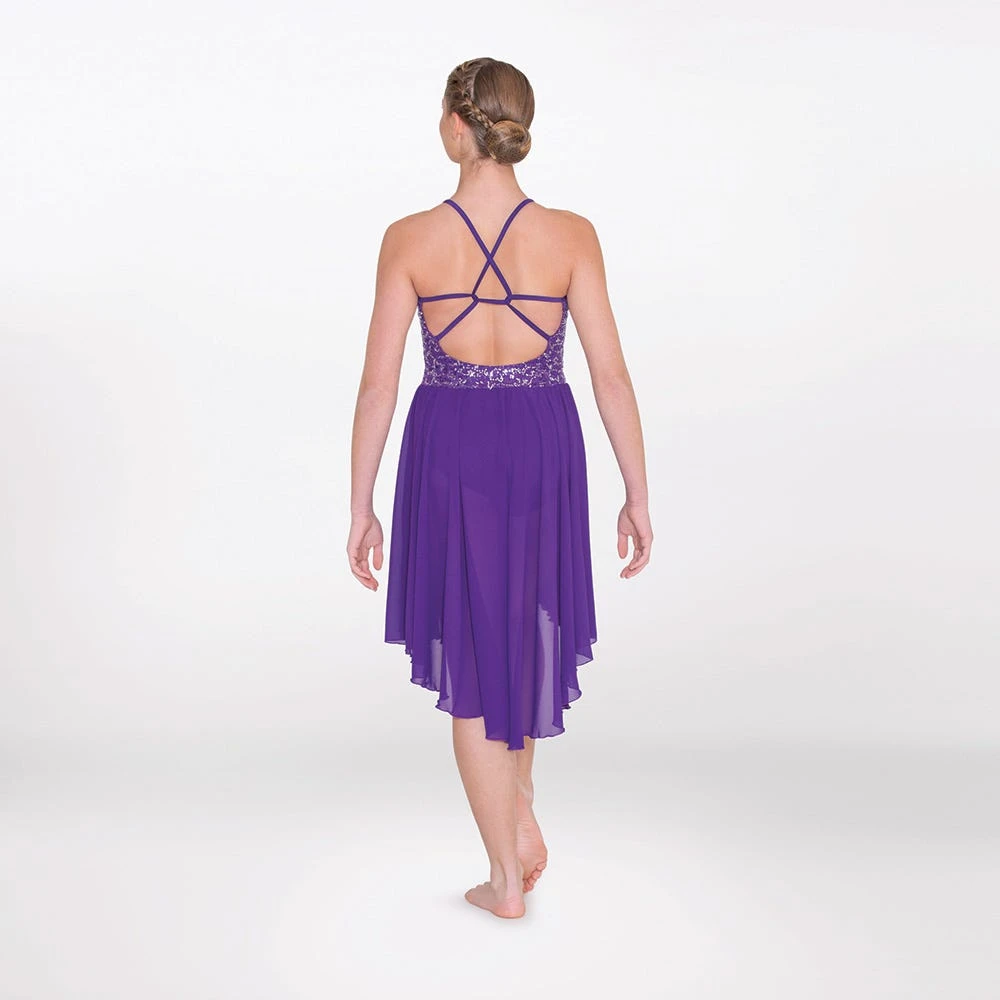 - Unleash your lyrical Goddess in this stunning crossed strap sequin dress from 1st Position. The sequin-imbued bodice sees you sparkle, and the open, cross-strap back inspires you to captivate.