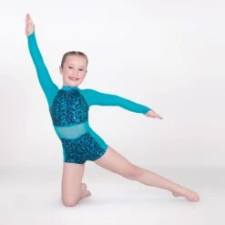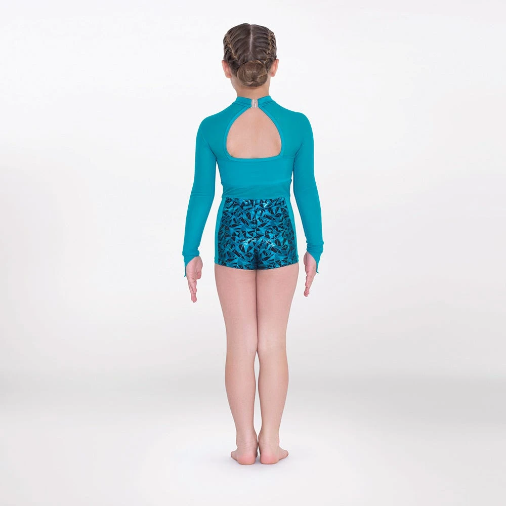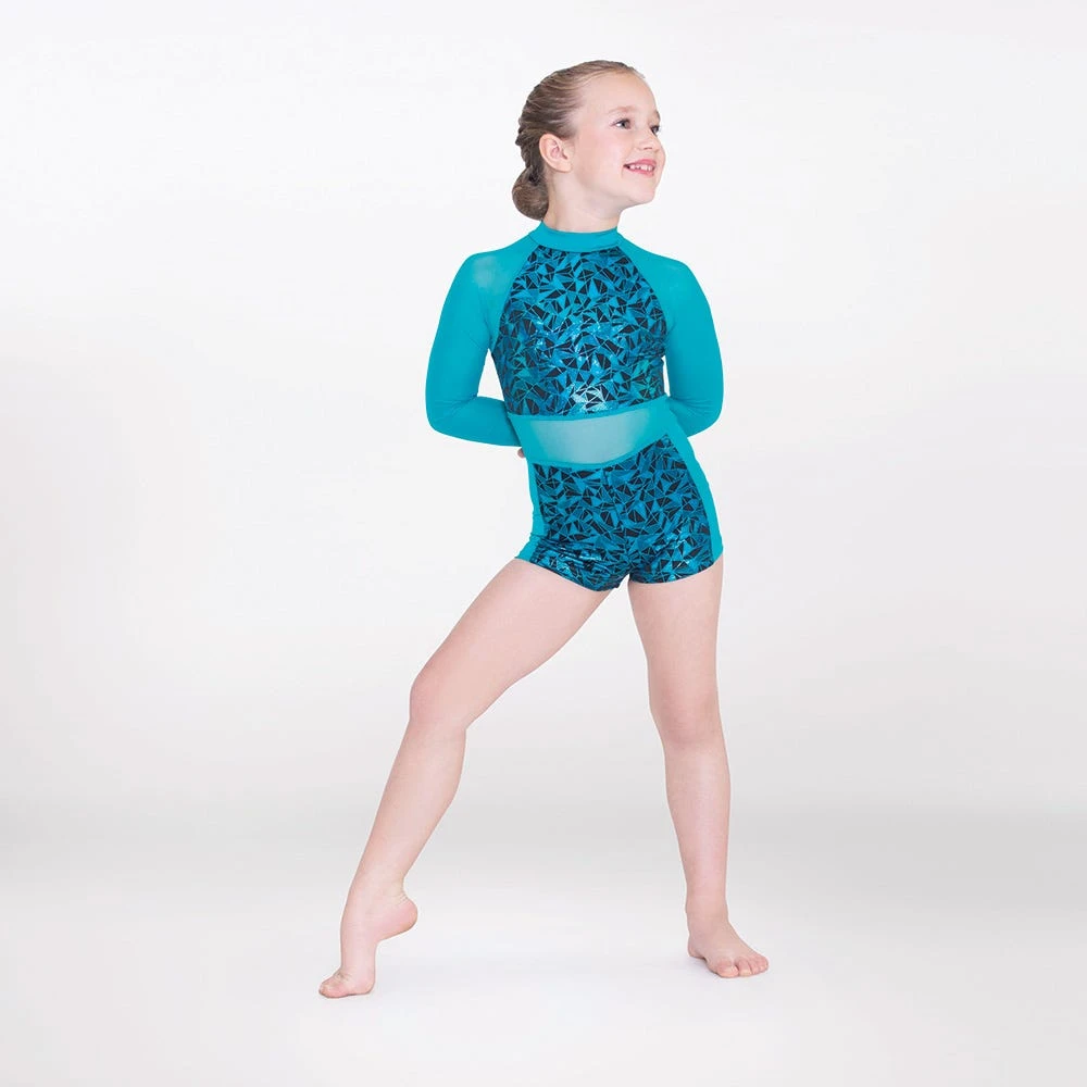 - Put on an unforgettable performance in this unique geometric panelled biketard from 1st Position. Characterised by geometric patterns in metallic foil print and smooth mesh sleeves, your every move is guaranteed to turn heads.