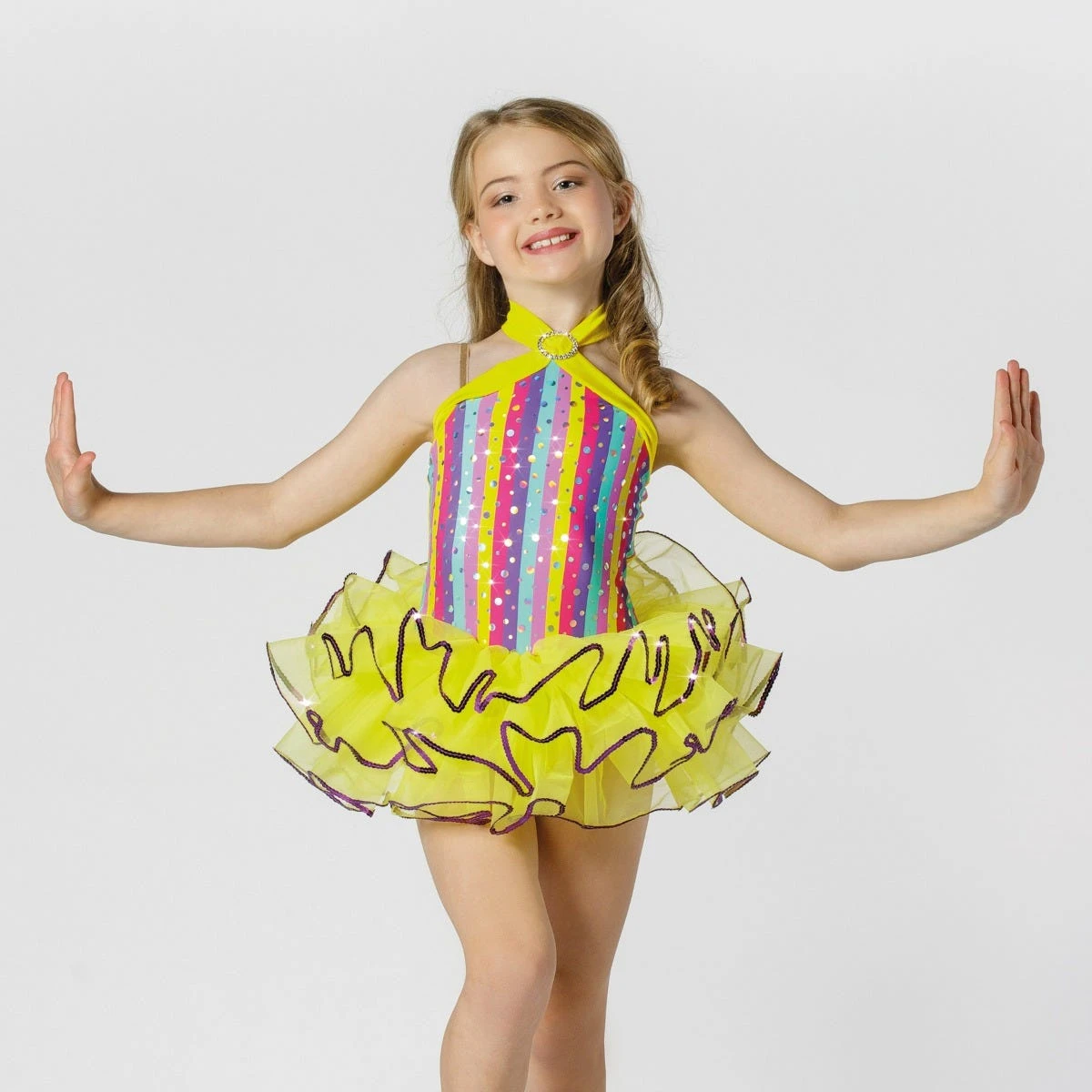 Light up the arena in this dazzling multicoloured tutu from 1st Position, perfect for little dancers to showcase their passion and energy.