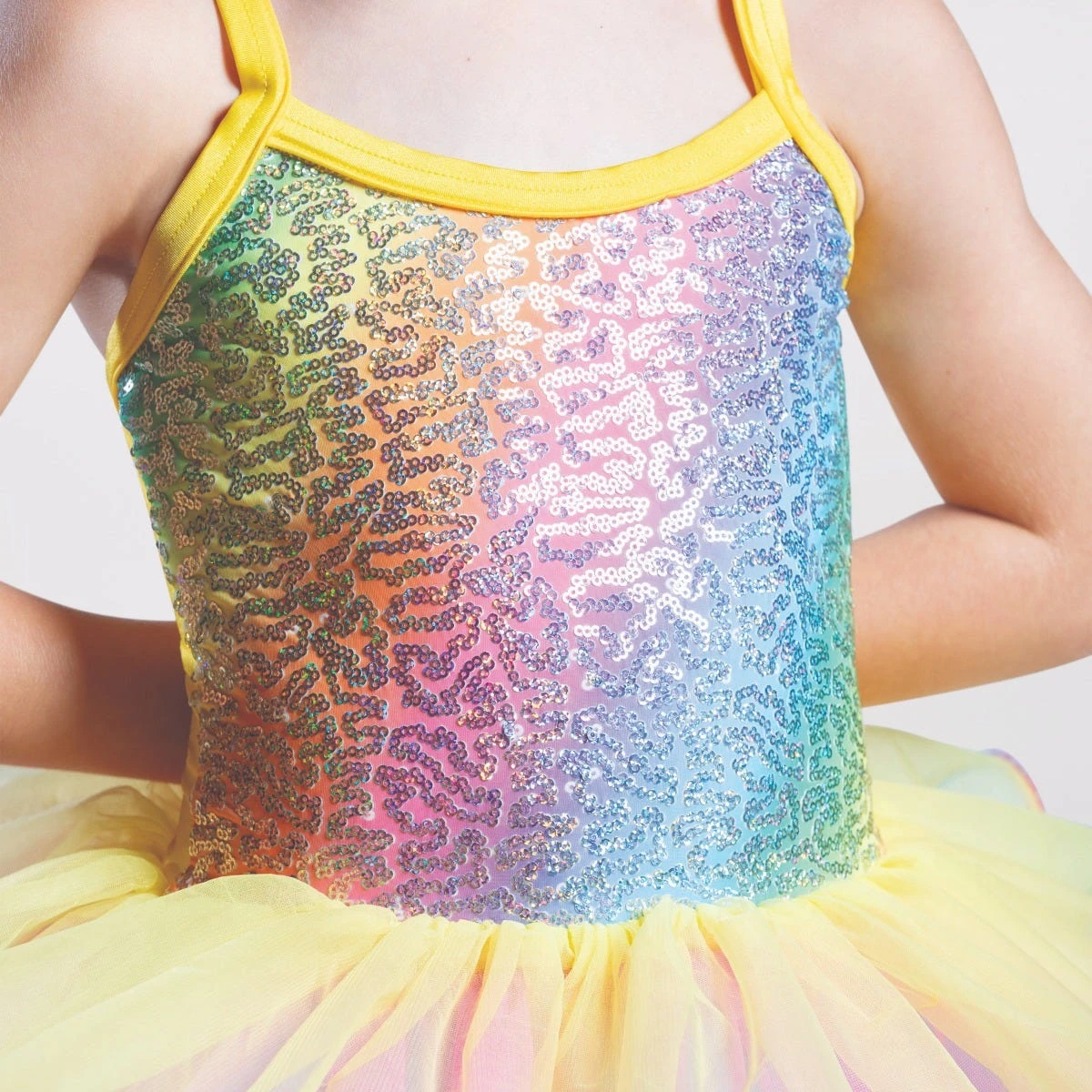 - Captivating sequin rainbow ombré bodice with yellow trim