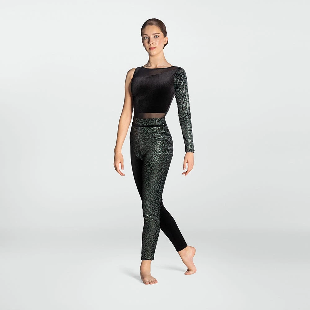 Let loose your inner animal and unleash your moves in this stunning leopard print unitard from 1st Position. The foil leopard print sleeve and leg combines with mesh yoke and waist to create a daring asymmetric aesthetic, and the soft velour allows dancers to display their wild side in complete comfort.