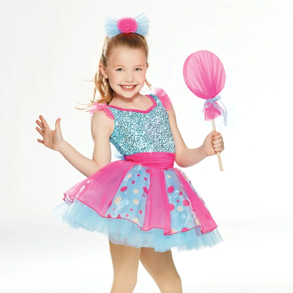 Fully lined sequin spandex leotard with organdy shoulder details has an attached spandex waistband and matching binding. Attached skirt is layers of organdy under a layer of organza. Includes hair bow, bobby pins, faux lollipop, hanger and garment bag