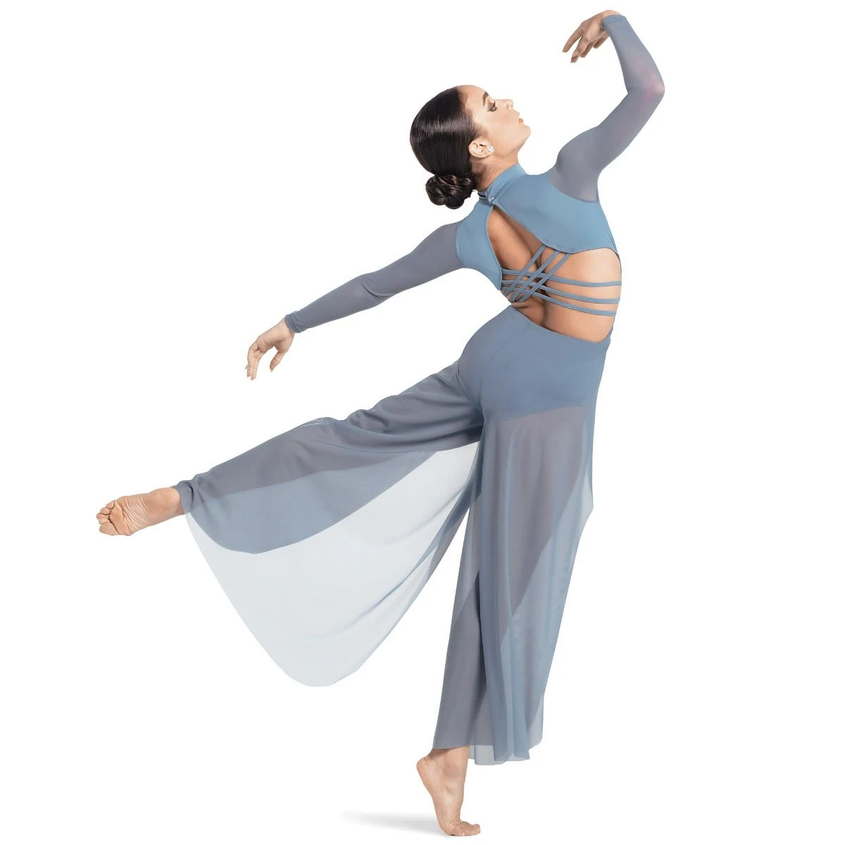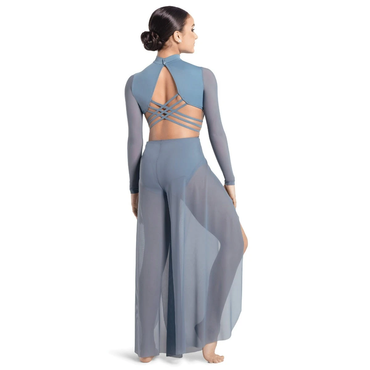 - Attached sheer mesh pants with side slits for ease of movement